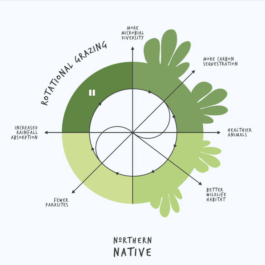 Rotational grazing mimics this behaviour giving the same benefits as in the wild. These include lower pest and disease pressure, improved forage quality, benefits to soil health, improved root structure, and carbon sequestration
